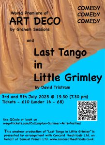 Next Generation Theatre return for another evening of comedy. A World Premiere play “ART DECO” by Graham Sessions and “LAST TANGO IN LITTLE GRIMLEY by David Tristram. You’re sure to have a good laugh with these two plays so book now.